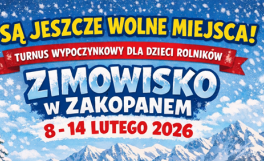 Informujemy, iż są jeszcze wolne miejsca na turnus wypoczynkowy dla dzieci rolników urodzonych po 01 styczniu 2010 roku do 31 grudnia 2021 roku w ośrodku wypoczynkowym:    „ZAKOPIEC” w Zakopanem w terminie  od  8 – 14 luty 2026 roku !W trakcie turnusu, uczestnicy otrzymują...