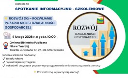 Planujesz rozwinąć działalność gospodarczą?Zapraszamy na spotkanie informacyjno-szkoleniowe dotyczące zasad przyznawania pomocy w ramach działania: „Rozwijanie pozarolniczej działalności gospodarczej: Rozwój DG”4 lutego 2026 r. Gminna Biblioteka Publiczna Filia w Twardej (Twarda, ul...