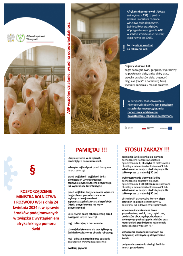 "ASF – wspólne działanie, wspólna odpowiedzialność" to hasło promujące świadomość i działania majace na celu zwalczanie afrykańskiego pomoru świń. Oznacza to, że zarówno hodowcy, myśliwi, jak i całe społeczeństwo powinni współpracować, aby zapobiegać rozprzestrzenianiu się tej choroby i minimalizować jej skutki - apeluje Główny Inspektorat Weterynarii.